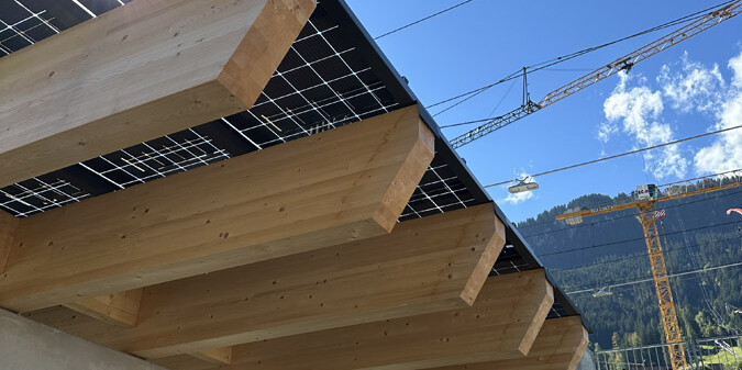 Für die Dachkonstruktion setzt man auf Leimbinder-Holz, was bereits beim Aufbau für eine positive CO₂-Bilanz sorgt. Die Dacheindeckung erfolgt mit Trapezblech, auf dem die PV-Module montiert werden.