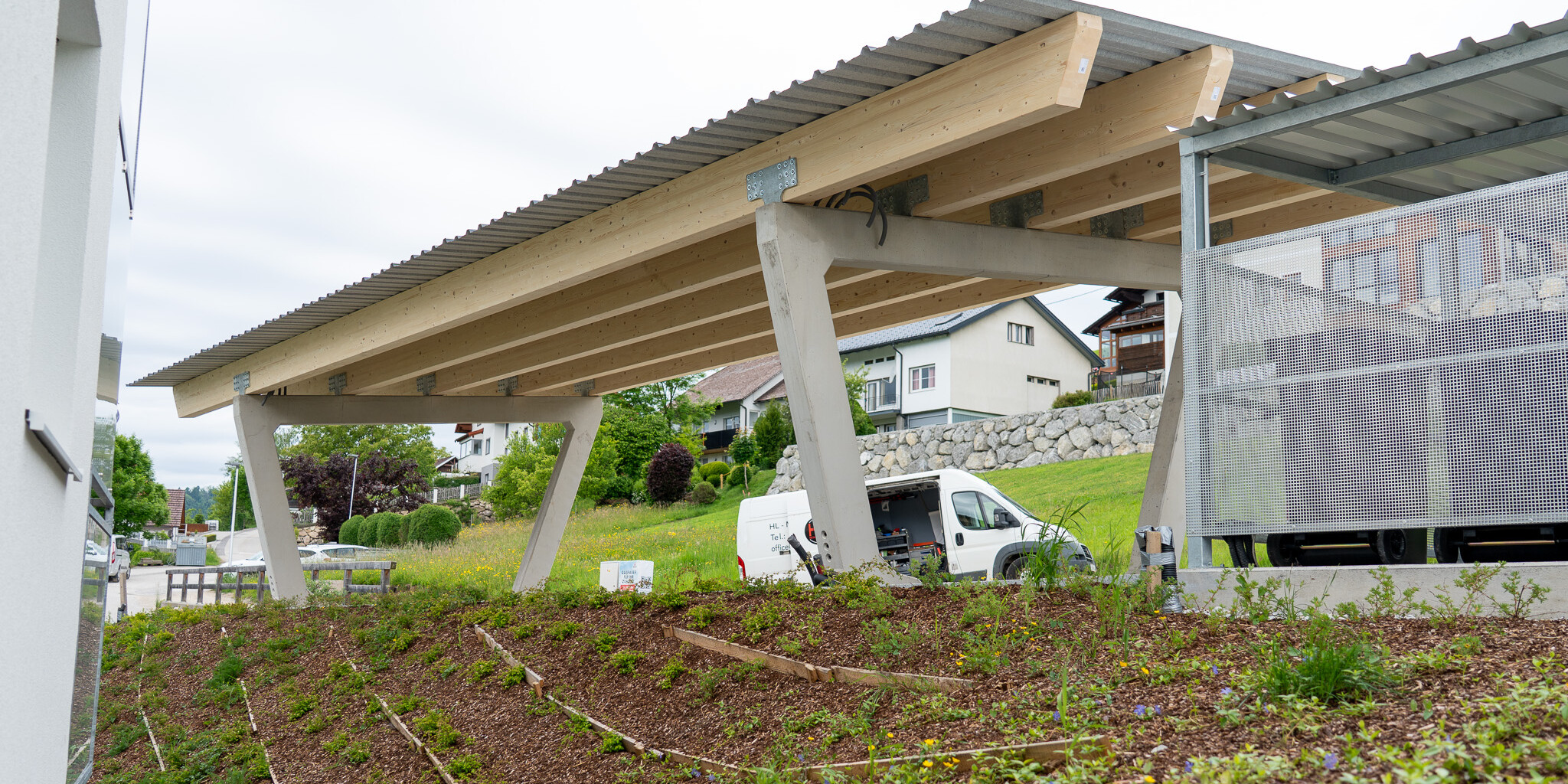 Zum Vergleich: Ein klassischer Carport aus I-Trägern und Trapezblech (ohne Holz) verursacht +1.085 kg CO₂ je Parkplatz – also mehr als eine Tonne Treibhausgas-Emissionen allein beim Bau!