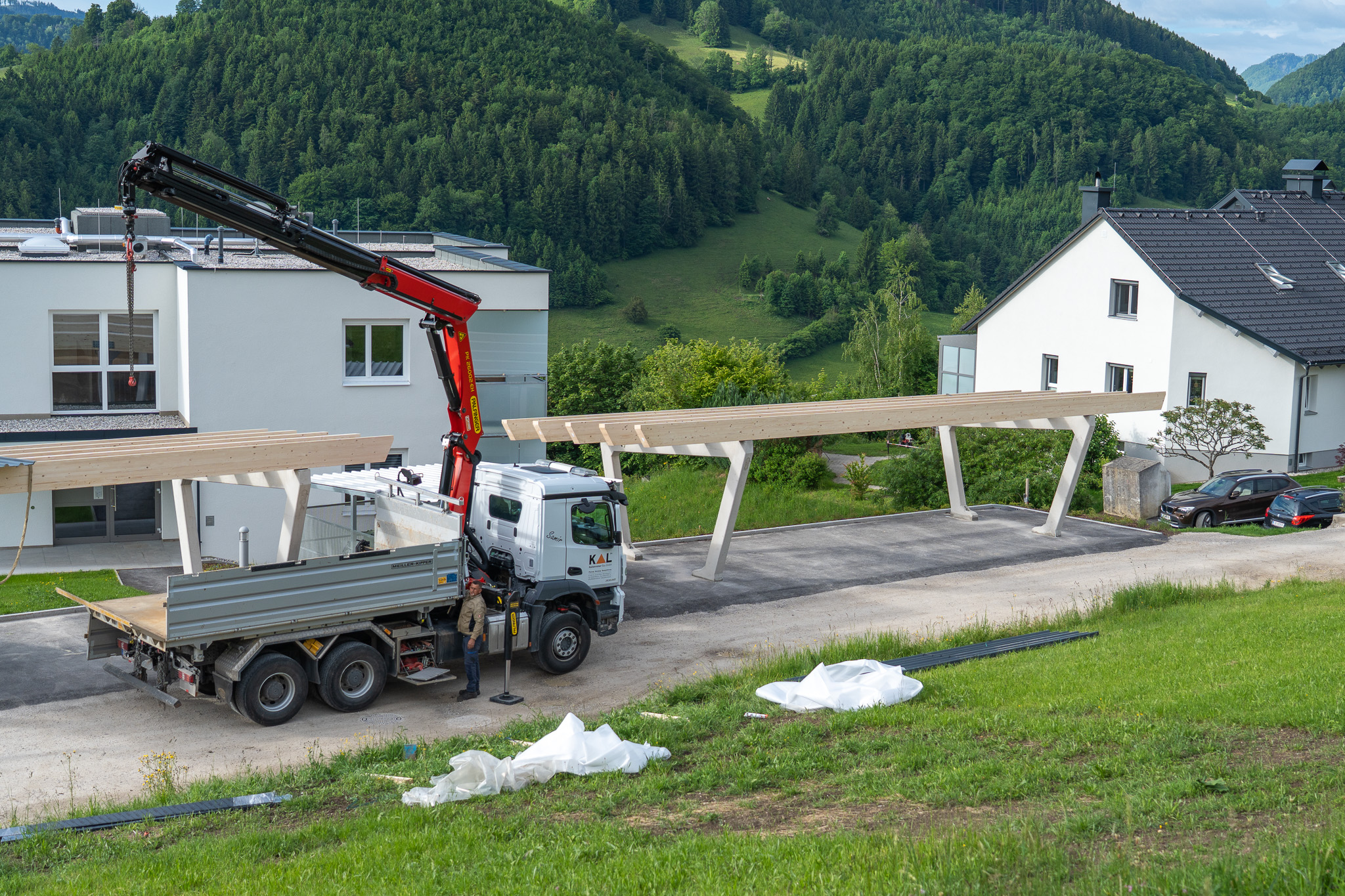 Für die Dachkonstruktion setzt man auf Leimbinder-Holz, was bereits beim Aufbau für eine positive CO₂-Bilanz sorgt. Die Dacheindeckung erfolgt mit Trapezblech, auf dem die PV-Module montiert werden.