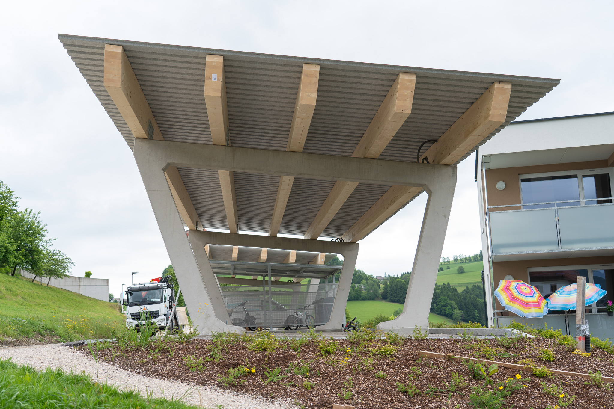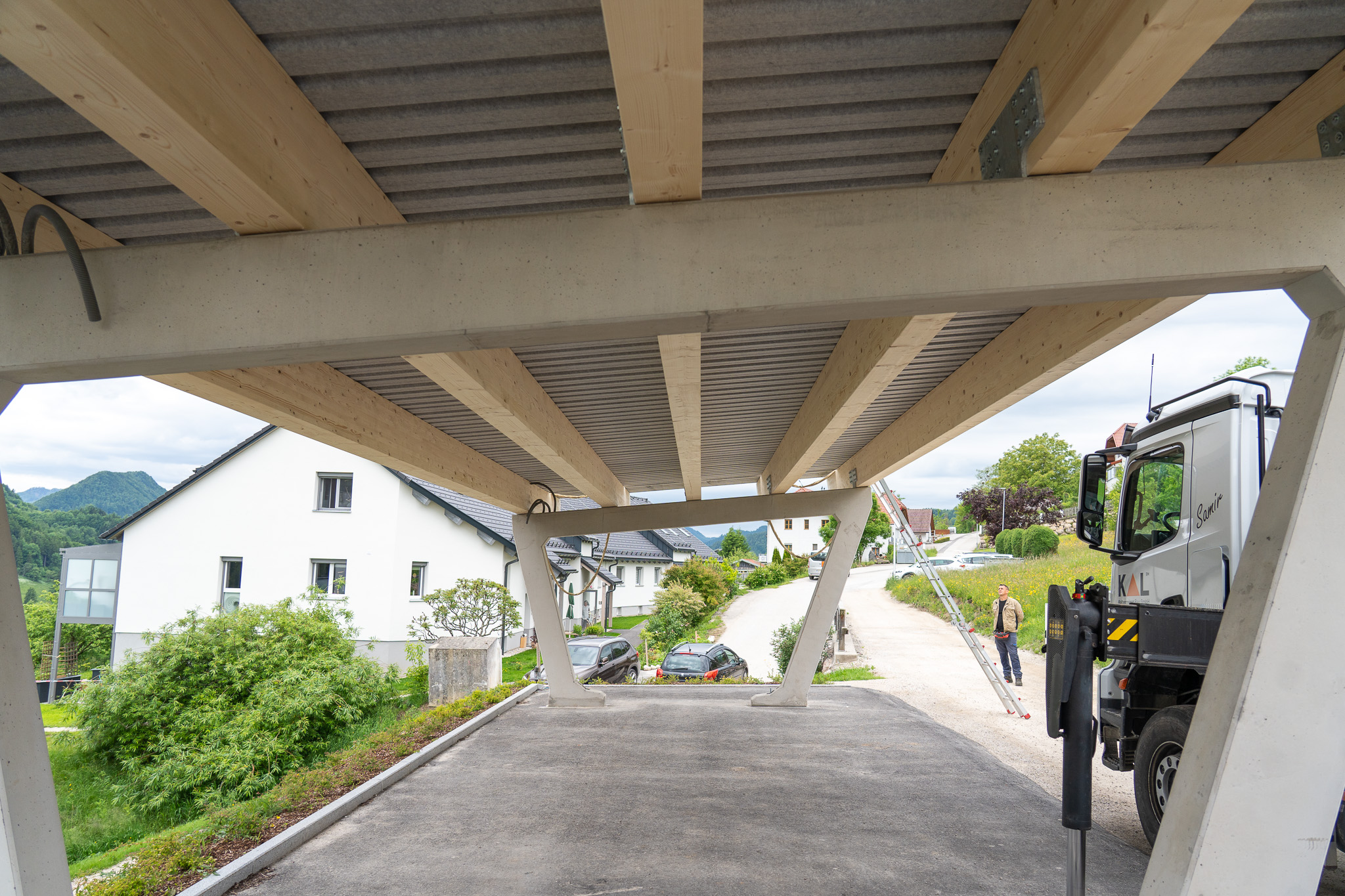 Eine Besonderheit des Projekts ist die gewählte Bauweise: Die Carports kommen ohne klassische Fundamente aus. Stattdessen wurden lediglich kleine Sockel mit Ausgleichsmasse errichtet. Die Verankerung erfolgt über Asphaltschrauben direkt im bestehenden Belag – ressourcenschonend, schnell und nahezu rückbaulos.