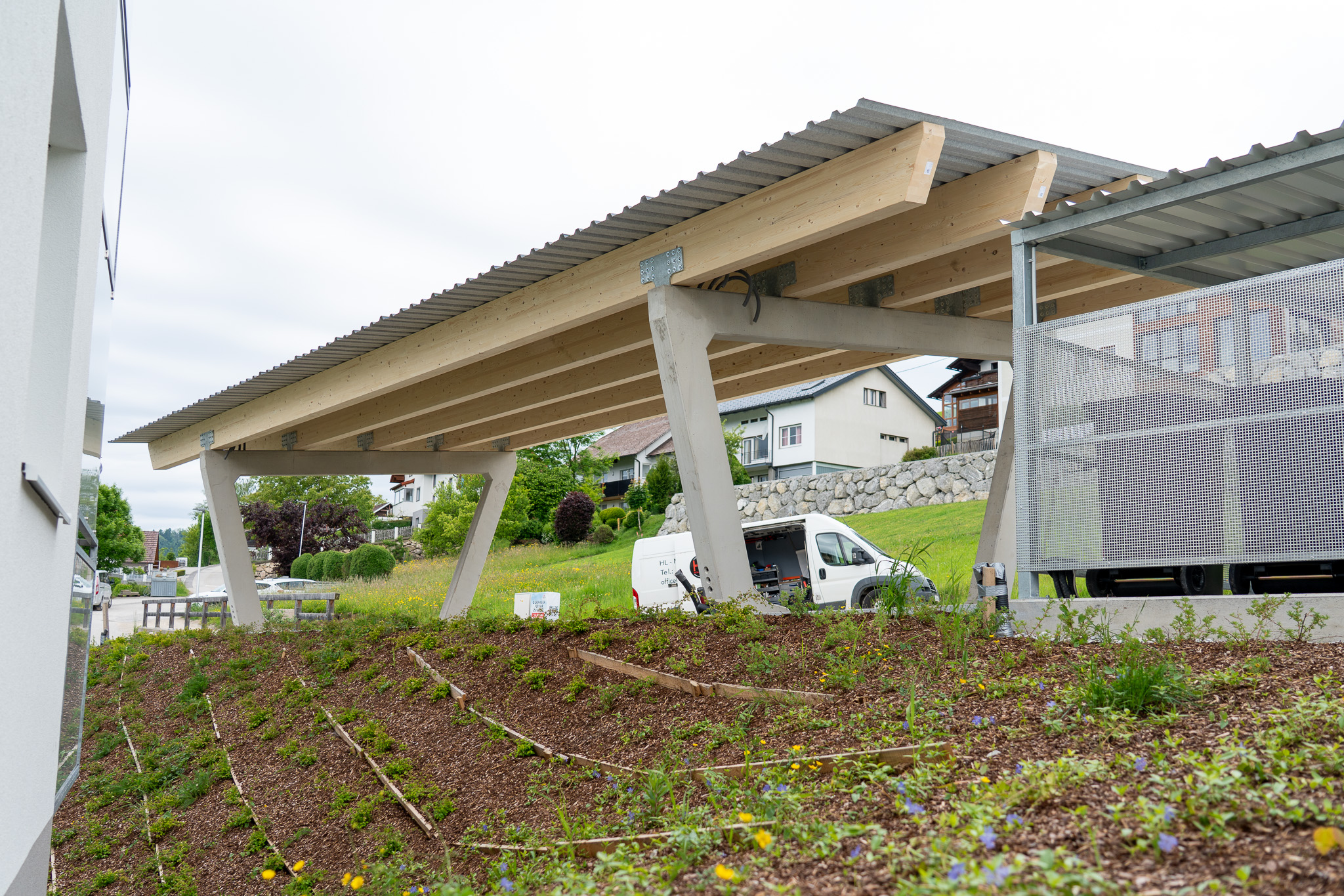 Zum Vergleich: Ein klassischer Carport aus I-Trägern und Trapezblech (ohne Holz) verursacht +1.085 kg CO₂ je Parkplatz – also mehr als eine Tonne Treibhausgas-Emissionen allein beim Bau!