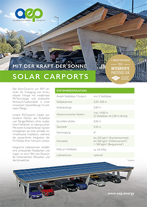 Die Solar-Carports von AEP vereinen die Erzeugung von erneuerbarer Energie mit modernster PV-Technologie und praktischer Parkraum-Funktionalität in einer innovativen Gesamtlösung mit zeitlosem Design.