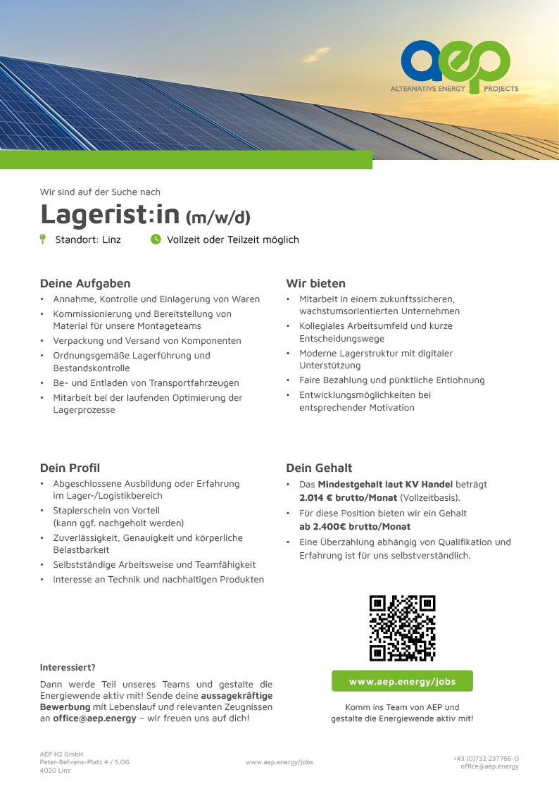 Then become part of our team and actively shape the energy transition! Send your detailed application with CV and relevant certificates to office@aep.energy – we look forward to hearing from you!