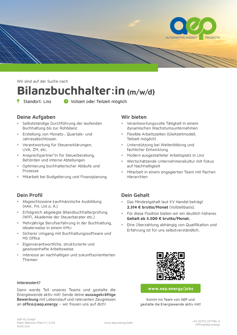 Dann werde Teil unseres Teams und gestalte die Energiewende aktiv mit! Sende deine aussagekräftige Bewerbung mit Lebenslauf und relevanten Zeugnissen an office@aep.energy – wir freuen uns auf dich!